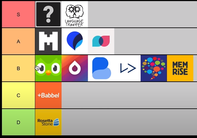 B - Duolingo, Drop, Busuu, Lingvist, Hellotalk, Memrise.