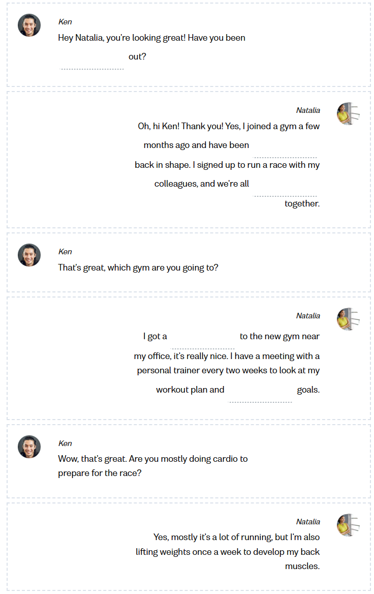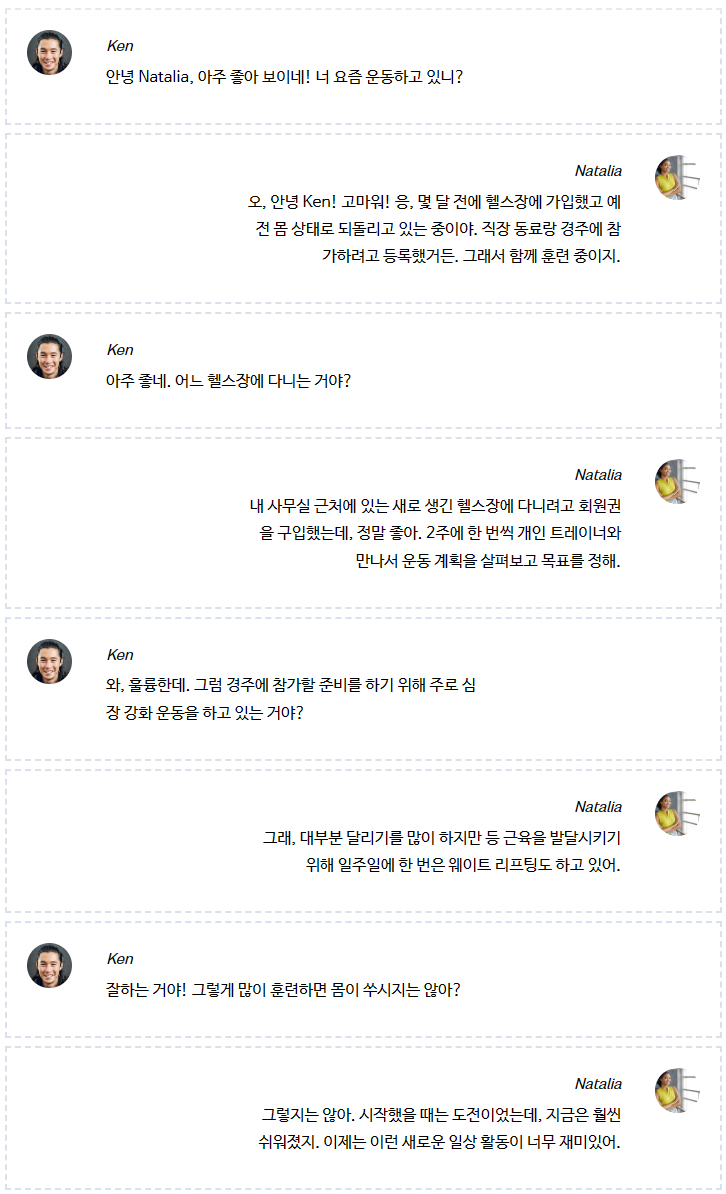 이제 신체 단련과 관련된 일상 활동에 대해 이야기할 때 사용하는 표현을 자세히 배워보겠습니다. 또한, 헬스장에 실제로 다니지 않더라도 건강한 몸 상태를 만드는 일에 관해 이야기하는 방법도 살펴볼 것입니다.